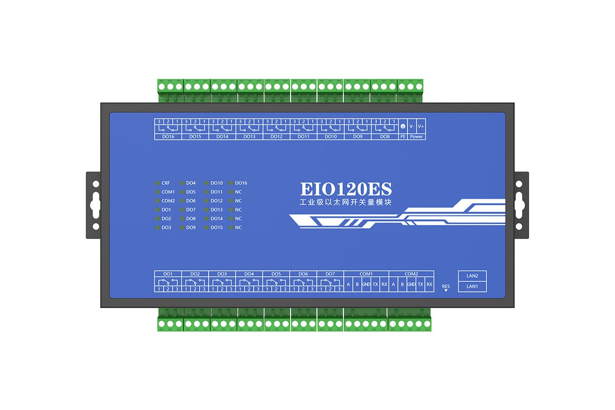 EIO120ES是我公司研发的开关量输出控制模块,提供2路以太网口,支持交换机功能,16路继电器输出,2路RS232/RS485串口,同时还集合了串口服务器和Modbus网关的功能。